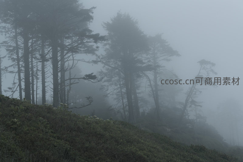 青翠山坡在浓雾中若隐若现,高大松树错落有致,整体画面如梦境般朦胧唯美,带来视觉与心灵的双重享受。