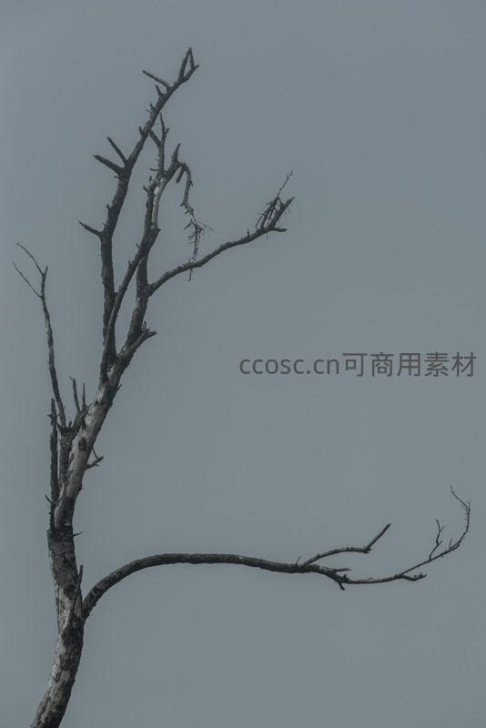 一根光秃的枯枝在灰白天空下伸展,扭曲的枝干诉说着生命的凋零与坚韧,画面充满苍凉感和艺术张力。