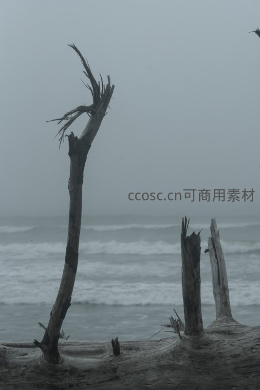 一根弯曲的枯枝在雾气缭绕的海边挺立,背景是不断拍打的白色浪花,构图简洁却富有情感张力,仿佛在诉说孤独与坚韧。