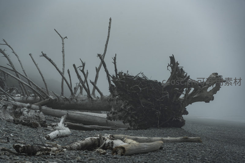 巨木残骸卧于雾滩,形态如龙骨神秘莫测