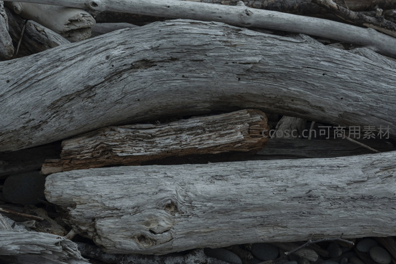 镜头聚焦于几根被海水和风沙长期侵蚀的漂流木,其表面布满深浅不一的沟壑与裂纹,每一处都铭刻着大自然无情雕琢的印记。