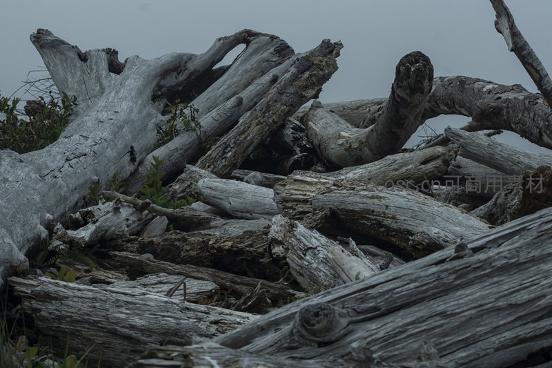 一堆饱经风霜的朽木随意堆叠在岸边,缝隙间顽强生长着翠绿的小草和蕨类植物,生动展现了生命在衰败中孕育新生的自然循环法则。