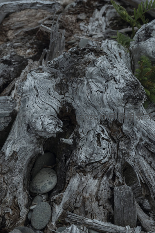 在灰暗色调的海滩上,一块饱经风霜的树根静静躺卧,其扭曲的形态与深邃的沟壑诉说着时间的故事,周围散落着圆润的卵石。