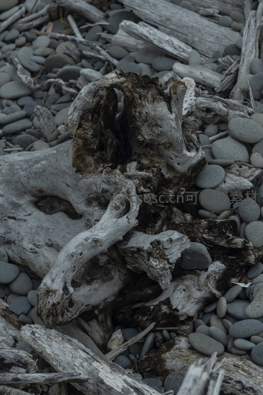 被海水冲刷上岸的枯木与无数光滑的鹅卵石相拥,构成一幅充满原始质感的自然画卷,展现了海岸生态的宁静与粗犷之美。