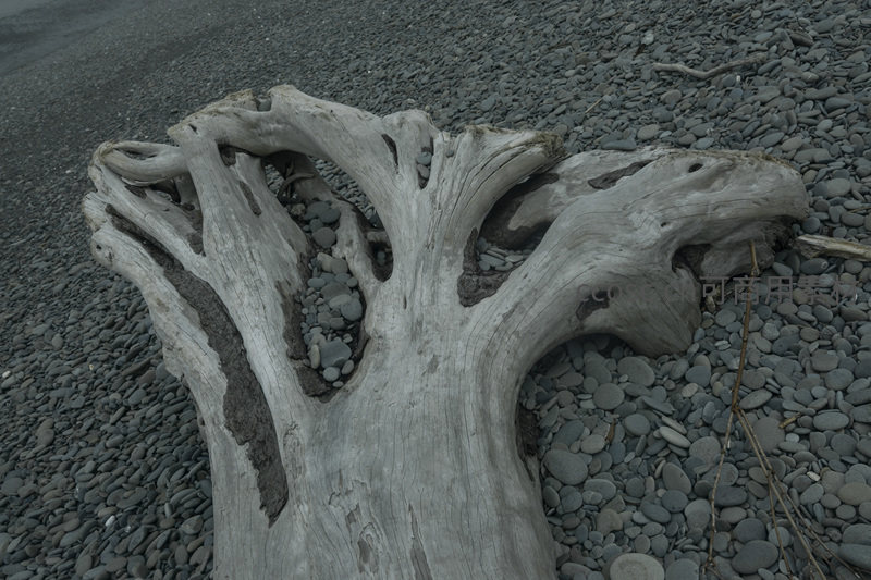 这块树根经过岁月洗礼,呈现出近乎化石的质感,它静卧在铺满灰色卵石的滩涂上,其独特的分叉结构与周围环境共同营造出一种苍凉而宁静的氛围。