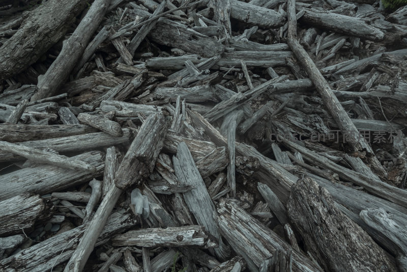 近距离捕捉了大量腐朽木头紧密堆叠的景象,每一块木头都带着独特的裂痕、孔洞和凹凸不平的表面,灰暗的色调强化了其饱经风霜的质感,充满了原始而粗犷的自然美感。