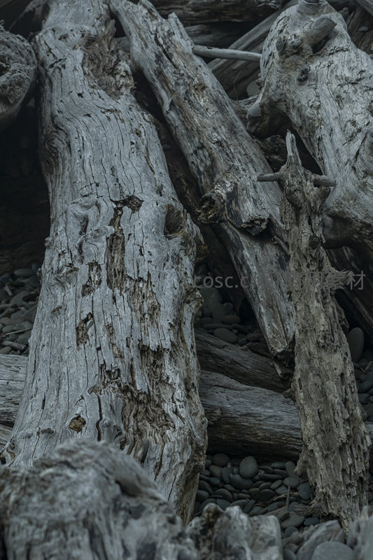 数根巨大且形态各异的漂流木横亘在铺满光滑鹅卵石的滩涂上,它们的树皮剥落,木质裸露,扭曲的枝干和深邃的沟壑记录着海浪与时间的侵蚀,营造出一种雄浑而寂寥的氛围。