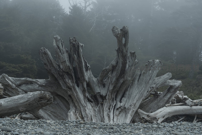 浓雾笼罩的海岸边,一株巨大枯木如雕塑般矗立在鹅卵石滩上,扭曲的树根与灰白的树干诉说着岁月沧桑,背景森林若隐若现,营造出神秘而宁静的氛围。