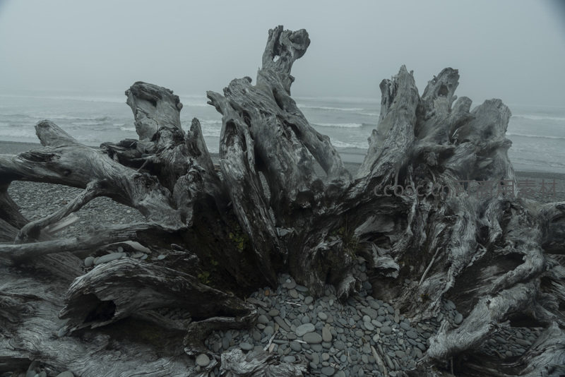 在波涛汹涌的海边,一截被海水和时间侵蚀的巨大树根静静卧于石滩之上,粗糙的纹理与远处翻滚的白浪形成强烈对比,展现出自然力量下生命的坚韧与凋零之美。