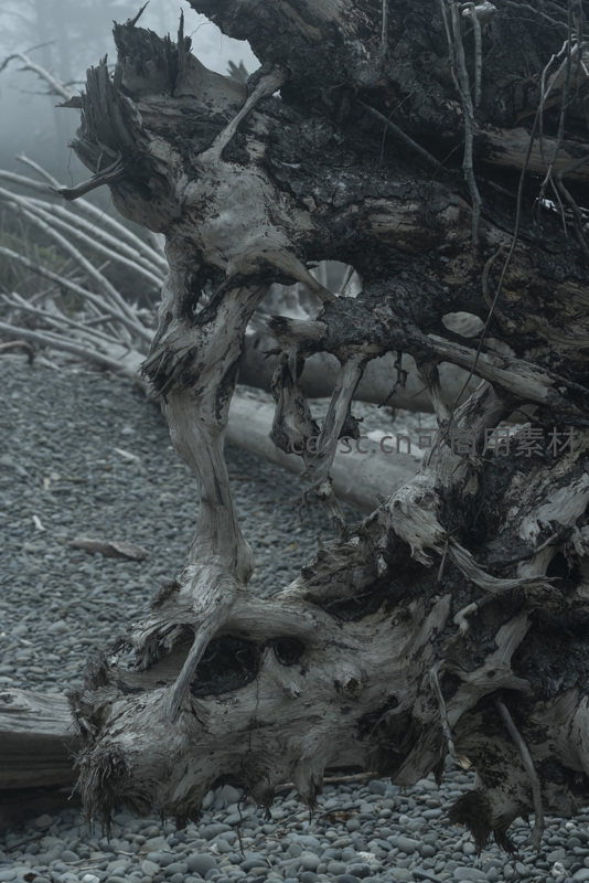 近距离捕捉枯木内部的复杂结构,深邃的孔洞、斑驳的裂纹和缠绕的细枝共同构成一幅天然的抽象画,灰暗色调强化了时光流逝的痕迹,展现自然造物的精细与沧桑。