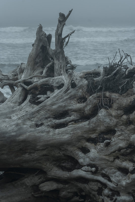 狂风将至,海浪在远处翻腾咆哮,前景中饱经风霜的枯木岿然不动,其粗犷的肌理与动荡的海面形成动静对照,传递出一种肃穆的等待感与自然伟力的压迫感。