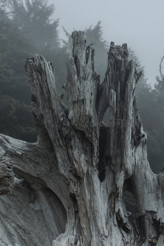 近距离观察这棵饱经风霜的树桩,其粗粝的纹理和断裂的枝干在薄雾中清晰可见,仿佛一座无声的纪念碑,记录着流逝的时光。