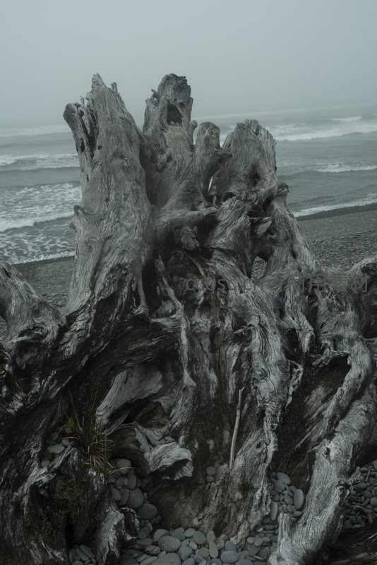 一个饱受侵蚀的树桩在雾气笼罩的海边傲然挺立,身后是不断涌来的浪花。它那斑驳的表面和嶙峋的轮廓,仿佛一位孤独的守望者,在岁月与海风中默默承受着自然的洗礼。