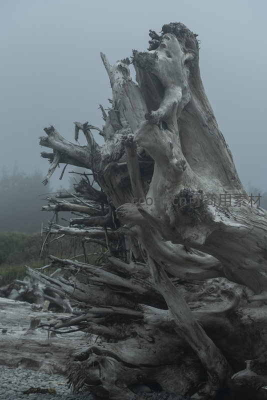 浓雾中矗立的巨型枯树,枝干嶙峋如骨骼,宛如史前巨兽的遗骸,在朦胧中散发出神秘而庄严的气息,引人遐想。