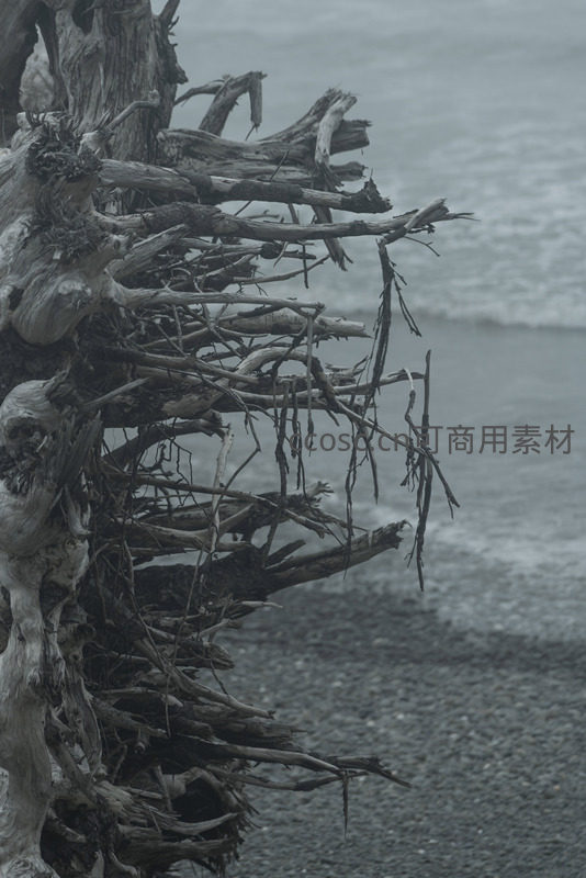 近景的枯木枝干形成天然剪影,背景是轻柔拍打的海浪与灰色沙滩,整体画面宁静致远,展现自然力量与时间的对话。