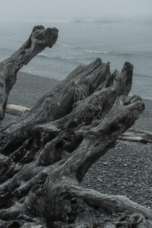 巨大的漂流木横卧在灰蒙蒙的卵石滩上,背景是翻涌的海浪。它沉默地躺在那里,仿佛是大海赠予陆地的一件古老而粗犷的艺术品。