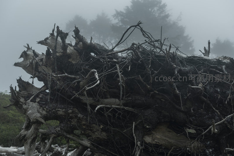浓雾弥漫的森林边缘,一堆纠缠交错的枯木和树根堆积在一起,宛如一座被时间掩埋的远古遗迹,散发着神秘而阴郁的自然气息。