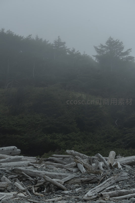 浓雾笼罩着海岸线,巨大的漂流木散落在布满鹅卵石的海滩上,背景是若隐若现的茂密森林,营造出一种神秘而孤寂的自然氛围。