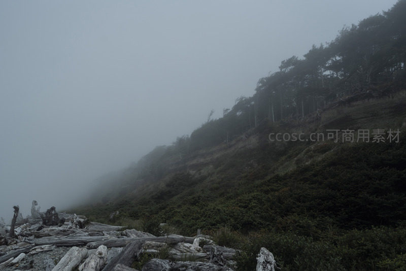 陡峭的山崖被浓雾半掩,山坡上覆盖着深绿色的植被,前景是散落的白色枯木,展现了大自然在雾气中原始而野性的力量与美感。