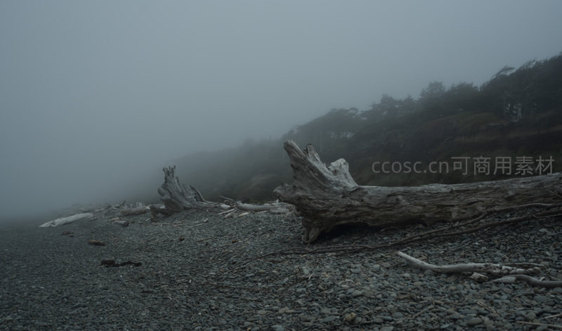 灰蒙蒙的雾气弥漫在整个画面,几块巨大的漂流木安静地躺在灰色的石滩上,远处的树林和天空融为一体,营造出一种宁静、空旷且略带忧郁的氛围。