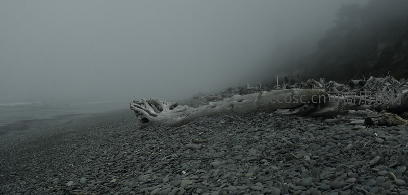 浓雾笼罩的海岸线上,巨大的漂流木横卧在灰黑色的卵石滩上,远处山林若隐若现,营造出一种神秘而孤寂的自然氛围。