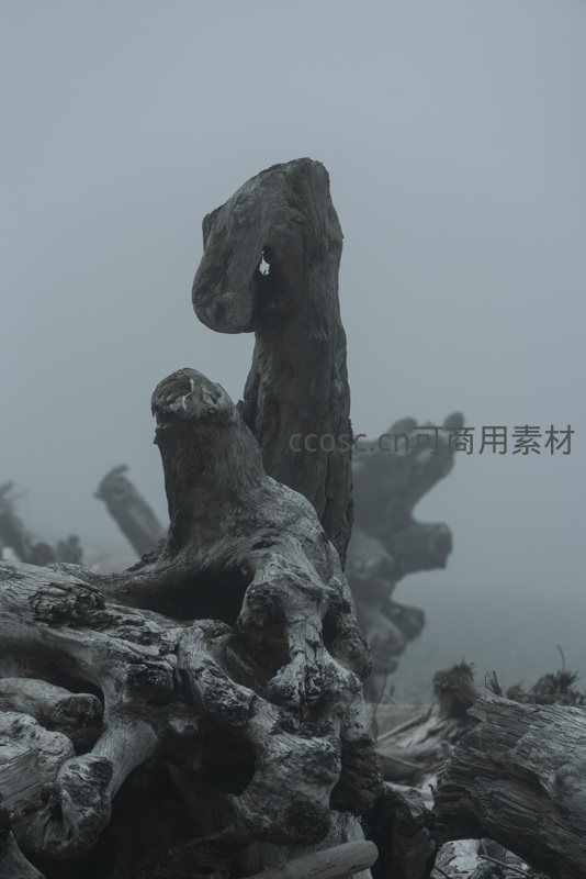 在弥漫的雾气中,几块造型奇特的枯木矗立于滩涂之上,宛如天然雕塑,赋予画面强烈的视觉冲击力与超现实的艺术美感。