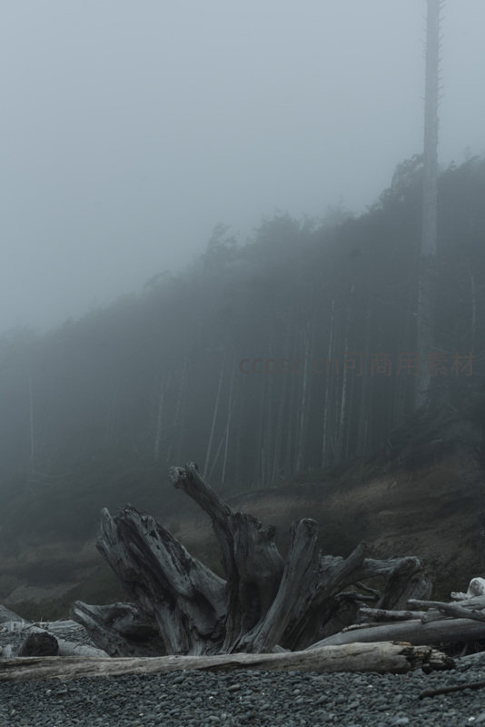 浓雾弥漫的海岸边,巨大的漂流木散落在灰黑色的鹅卵石滩上,背景是被雾气笼罩的幽深森林,营造出一种神秘而孤寂的自然氛围。