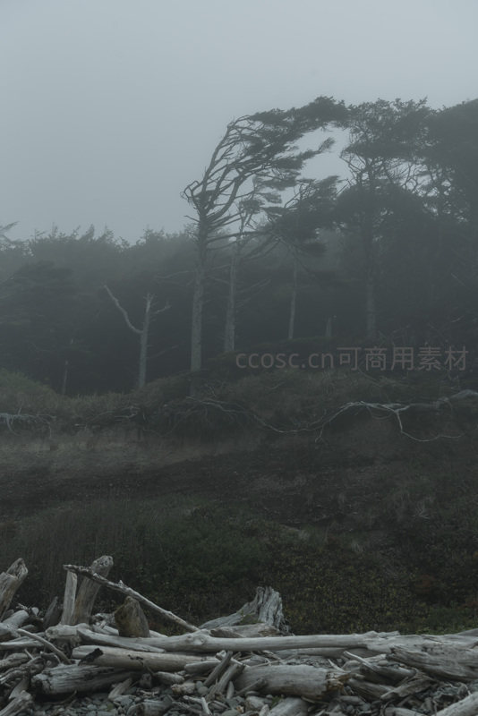 浓雾中,几棵被海风常年吹拂而形态奇特的树木矗立在山坡上,它们扭曲的枝干仿佛在无声地诉说着与自然抗争的故事,展现出生命的顽强。