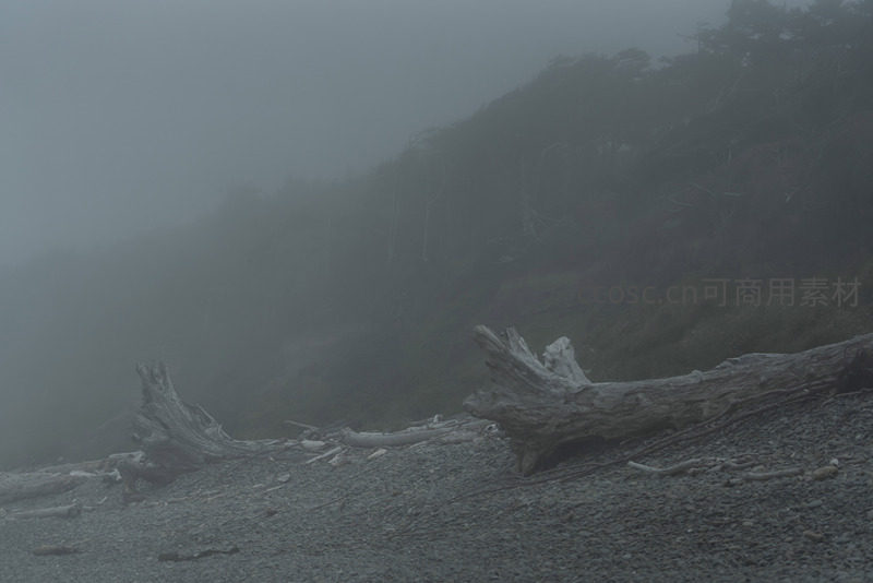 在弥漫的雾气中,巨大的漂流木横卧在布满鹅卵石的海滩上,背景是朦胧的山坡,展现出大自然的力量与时间的痕迹。