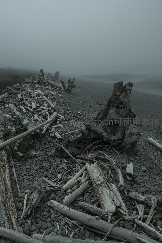 浓雾弥漫的沙滩上,大量枯木和树枝堆积在一起,形成独特的自然景观,仿佛诉说着海洋与陆地的故事。