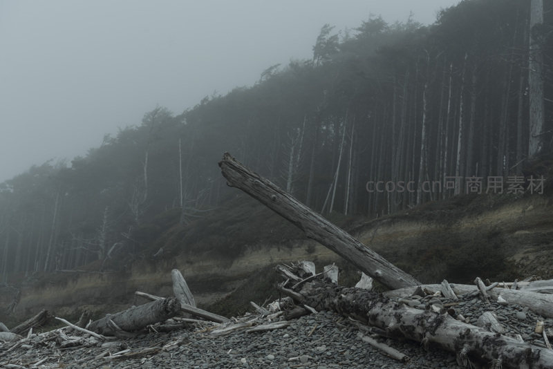 在浓雾弥漫的森林边缘,一根巨大的倒木斜倚在布满碎石的海滩上,背景是幽深的树林,整个画面充满原始与孤寂感。