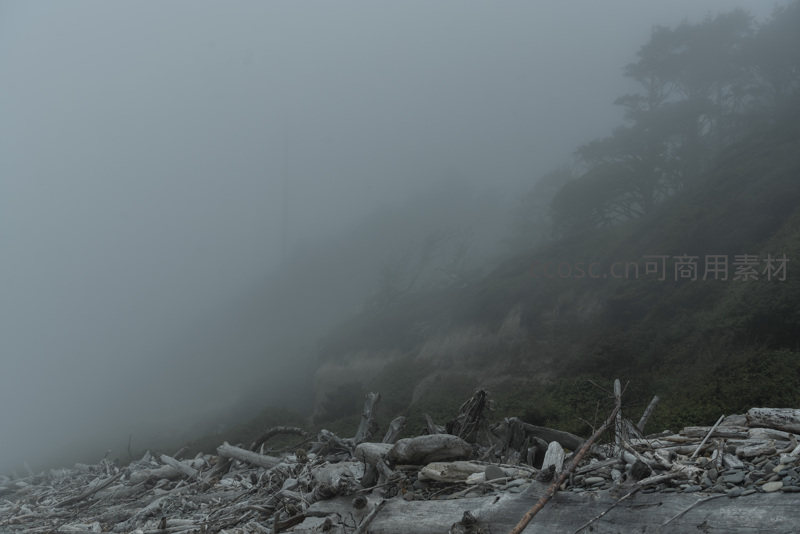 厚重的雾霭将整个海岸与山坡包裹,枯木散落在滩涂上,树木轮廓模糊,宛如一幅水墨画。