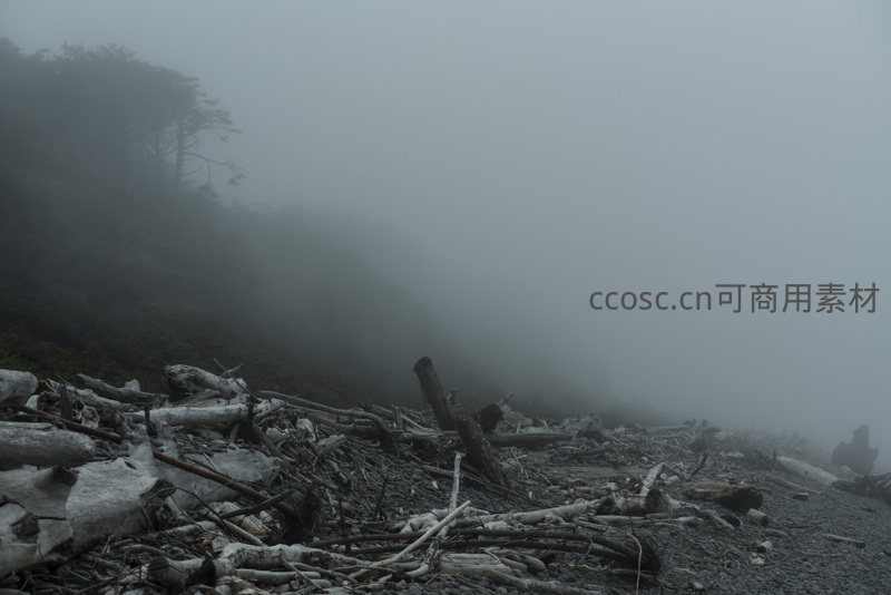 白茫茫的雾气吞没了远方,近处散落的枯枝败木在灰暗色调中延伸,营造出一种遗世独立的寂静感。