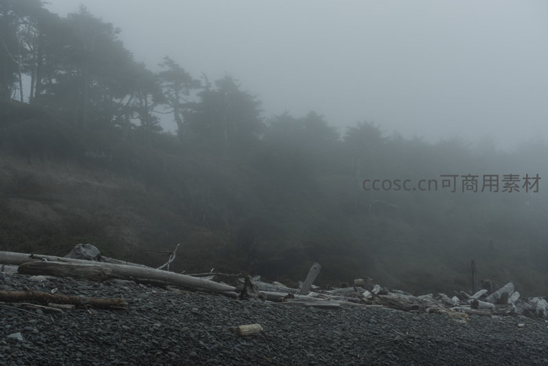 浓雾笼罩的海岸线,灰黑色卵石滩上散落着大量被海水冲刷的枯木,远处山坡上的树林若隐若现,营造出一种孤寂而神秘的自然氛围。