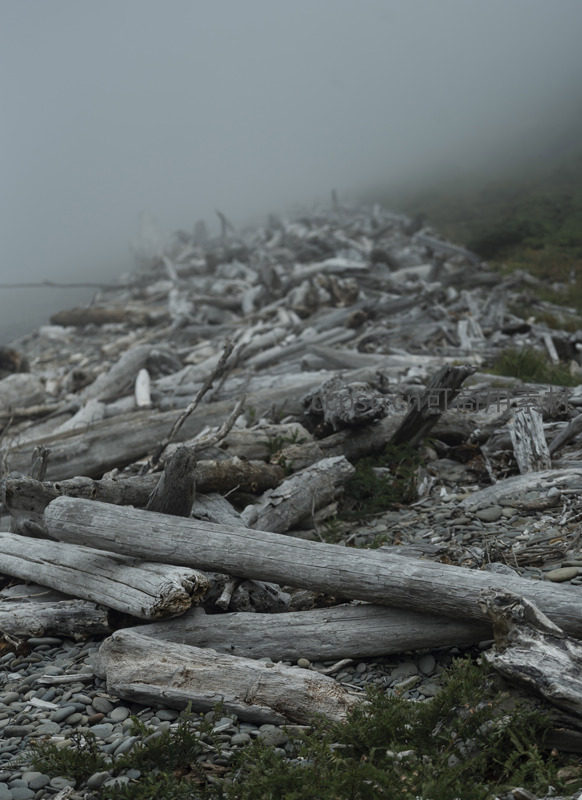 浓雾中的海岸,一堆堆被潮水推上岸的枯木如同天然雕塑,错落有致地分布在石滩上,与周围的绿植和远山共同构成一幅沉静而富有张力的画面。