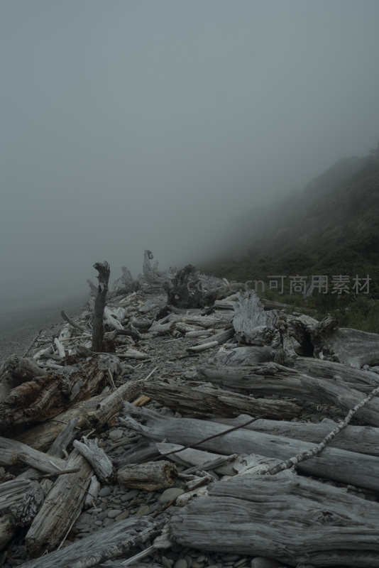 雾霭弥漫的海岸漂木如时光遗骸