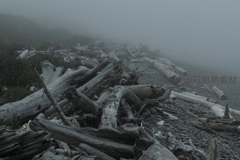在弥漫的雾气中,海滩上堆积的漂木错综复杂,如同远古战场遗留的残骸,展现着大自然原始、粗犷且充满力量的美感。