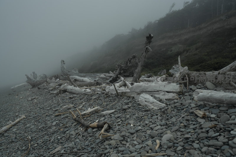 浓雾笼罩下的灰色石滩上,散落着形态各异的漂木,它们静默无言,仿佛承载着岁月的痕迹,营造出一种深邃而孤寂的诗意空间。