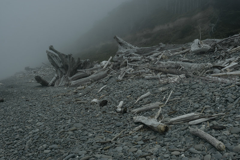 在弥漫的雾气中,大量被冲刷上岸的枯木堆积在灰黑色的滩涂上,形成一片独特的“枯木林”,展现着时间流逝与自然侵蚀的痕迹。