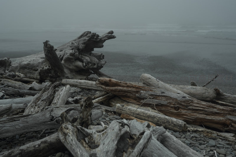 在弥漫的雾气中,一堆形态各异的枯木堆积在沙滩边缘,木质纹理清晰可见,与远处模糊的海面共同构成一幅沉静而富有质感的画面。