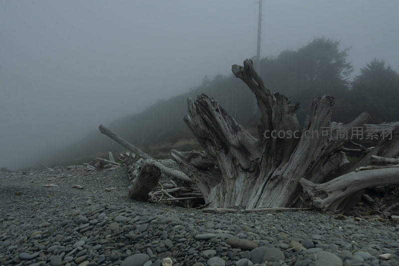 在一片被浓雾包裹的荒凉海滩上,饱经风霜的木桩和断枝散落在光滑的鹅卵石间,远处的树林若隐若现,充满原始的野性之美。