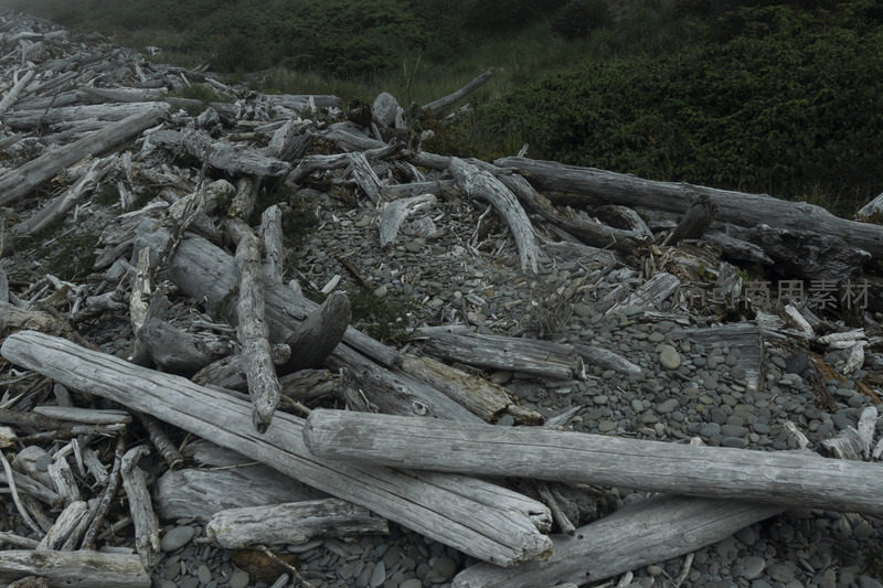 大量被海水冲刷上岸的漂流木杂乱地堆积在布满鹅卵石的海滩上,其粗糙的纹理和扭曲的形态构成了一幅充满力量感的自然雕塑作品。