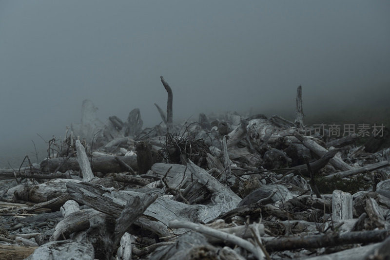 在一片被浓雾吞噬的海滩上,无数形态各异的枯木堆积如山,灰暗色调下展现出大自然原始而苍凉的美感。