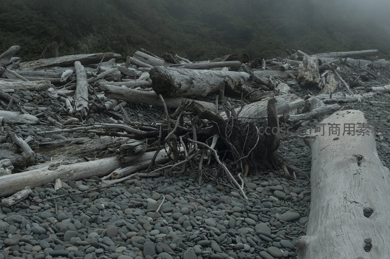 湿润的卵石滩上,盘根错节的漂木根系裸露在外,复杂的纹理与周围环境构成一幅充满生命力的自然生态图景。