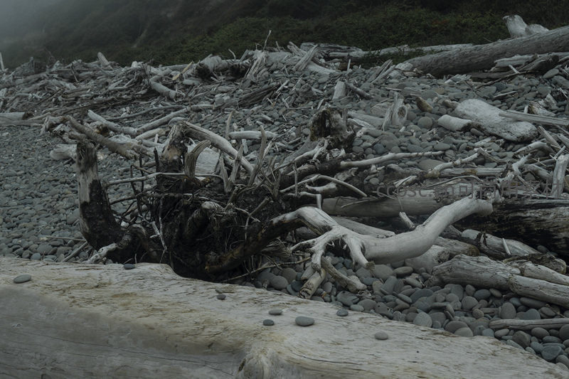 在低饱和度的灰暗色调中,海滩上枯木的扭曲根系与光滑卵石形成强烈对比,凸显出岁月侵蚀下的自然沧桑感。