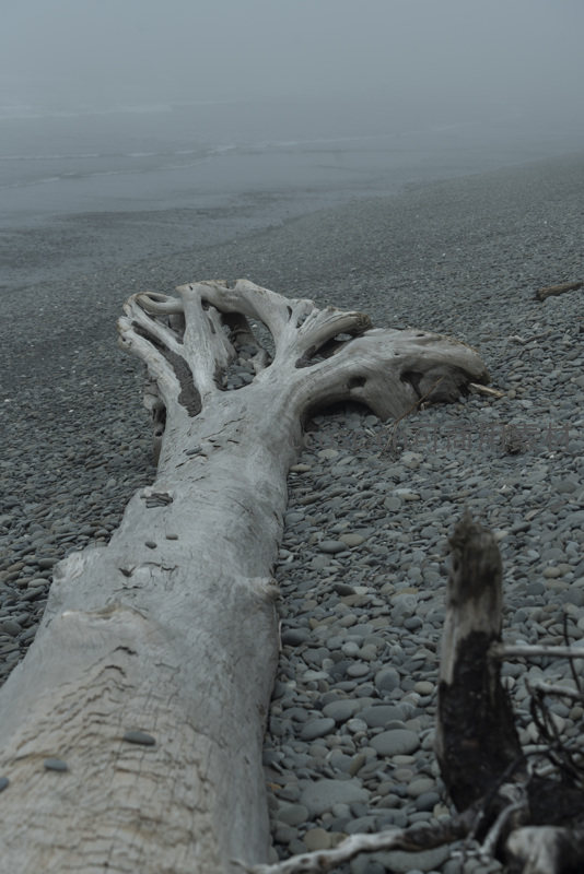 浓雾笼罩的海岸线上,大量被海水冲刷的漂木散落在灰色卵石滩上,营造出一种苍凉而宁静的自然氛围。