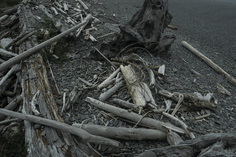 一片灰暗色调的沙滩上,布满了形态各异的枯木与残枝,它们随意散落,构成了一幅充满荒凉感与静谧气息的自然画卷。