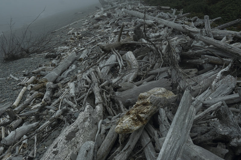 浓雾笼罩的海岸边,大量被海浪冲刷上岸的枯木堆积在石滩上,与远处朦胧的树林和海浪构成一幅苍凉而宁静的自然画卷。