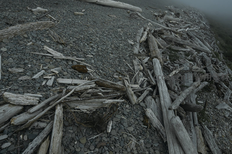 灰色调的鹅卵石海滩上,散落着形态各异的漂流木和细碎枯枝,在弥漫的雾气中显得格外孤寂,展现出原始自然未经雕琢的粗犷之美。