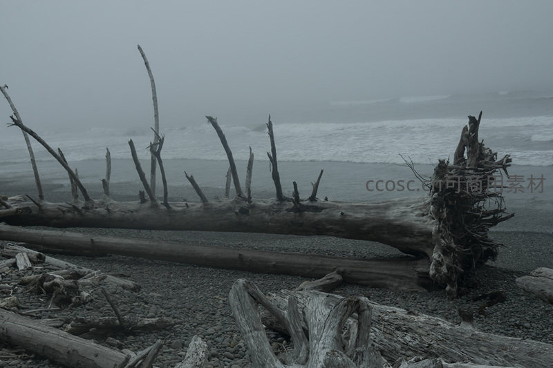 一根巨大枯木带着扭曲的根系和嶙峋枝干横卧在雾气缭绕的海滩上,仿佛自然的雕塑,诉说着海洋与陆地间无声的抗争与融合。